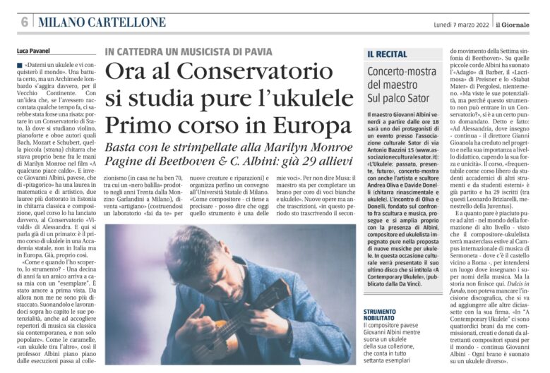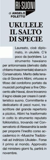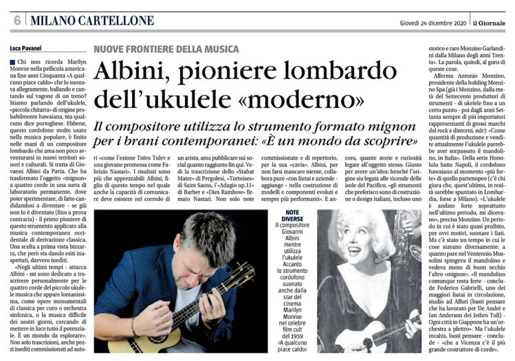 In his concerts, he takes the stage with meticulously chosen historical and modern instruments from a collection of over seventy ukuleles. A special emphasis is placed on instruments and luthiers of Italian origin, including notable names/brands such as Francesco Verginelli (FVguitars) – with whom he has initiated an intense and productive collaboration and research relationship that has led to the production of luxury / high-profile instruments – Lorenzo Lippi, Nicòla Turturro, Marco Todeschini (Antica Ukuleleria), Paolo Bianchi (Waiz), Giuseppe Triolo, Giovanni Pece, Peppe Treccia (Treccioliuto), and Mogar (Monzino Garlandini). Regarding Albini’s activity, they have been written about in Ukulele Magazine, Uke Magazine, The Syncopator, Ansa.it, Oggi, Open, Il Corriere della Sera, and several other magazines and newspapers. At this link, he has been interviewed on the first channel of Latvian national television.