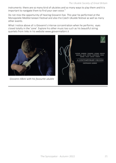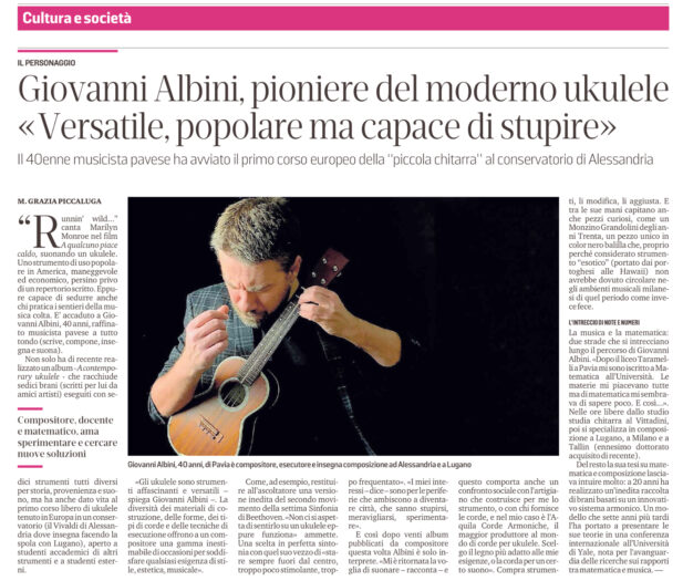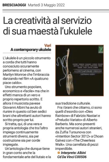 “…Albini wants to conquer a permanent place in the contemporary classical music landscape with his ukulele. […] Giovanni Albini manages to shed light on the different aspects of the ukulele and get rid of the incorrect nickname ‘pocket instrument’.” H. Gaudeus, Classiek-Centraal.be