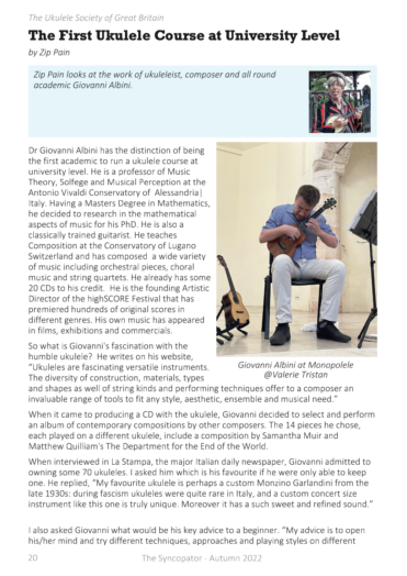 ► Roberto Squillaci, Arpeggio (2020) for ukulele solo (gCEA). Duration: 4′. Written for, commissioned and revision and fingering by Giovanni Albini.